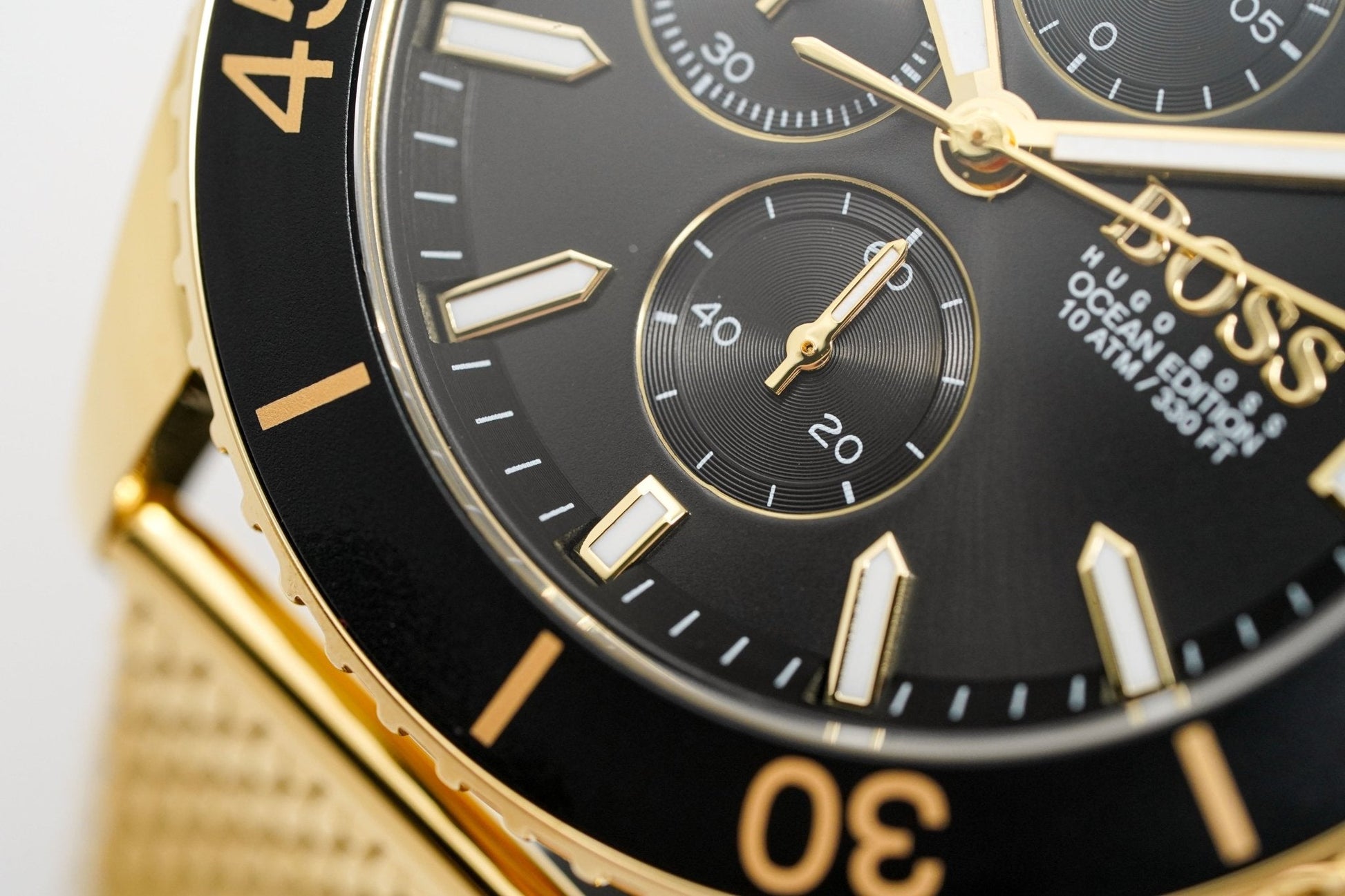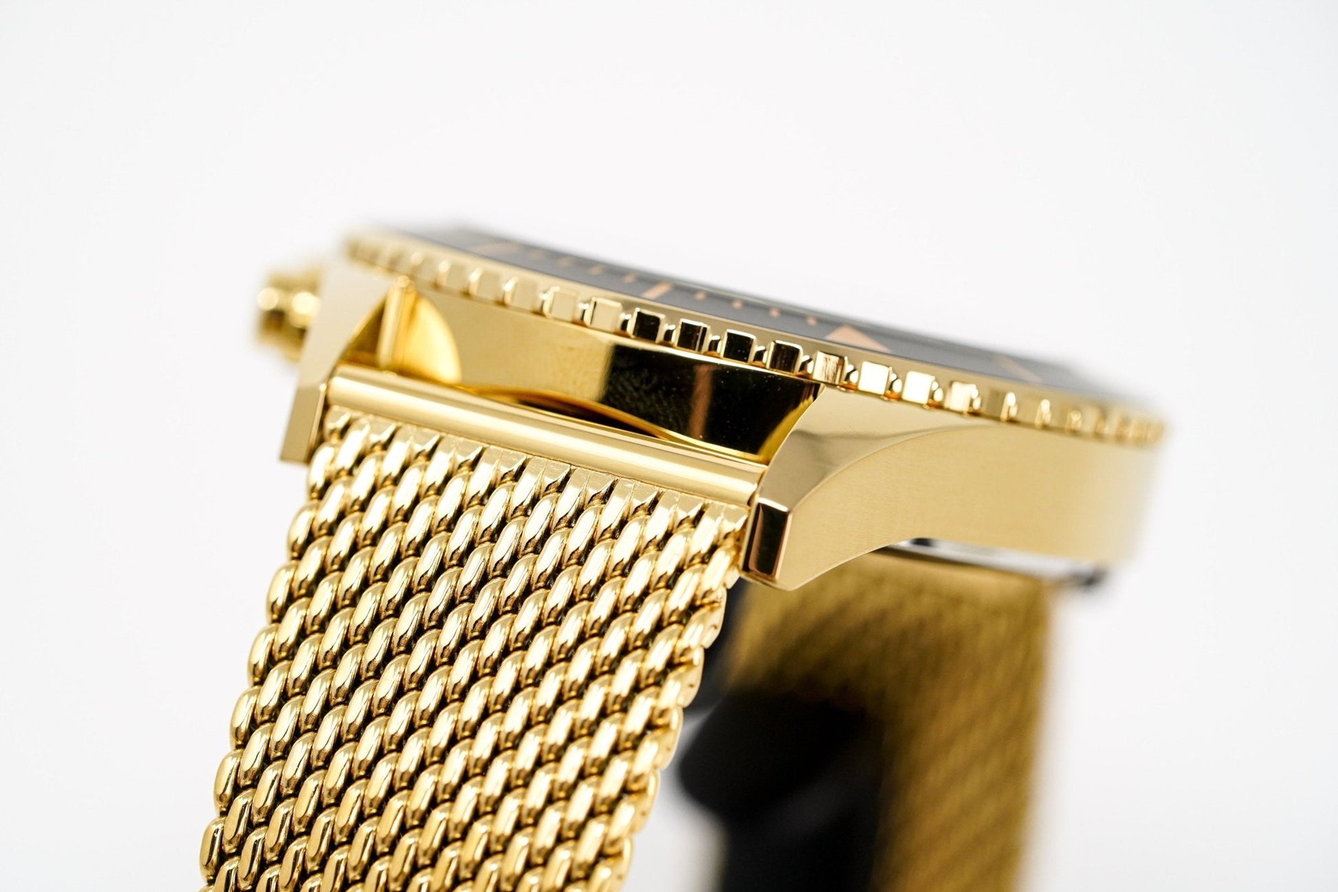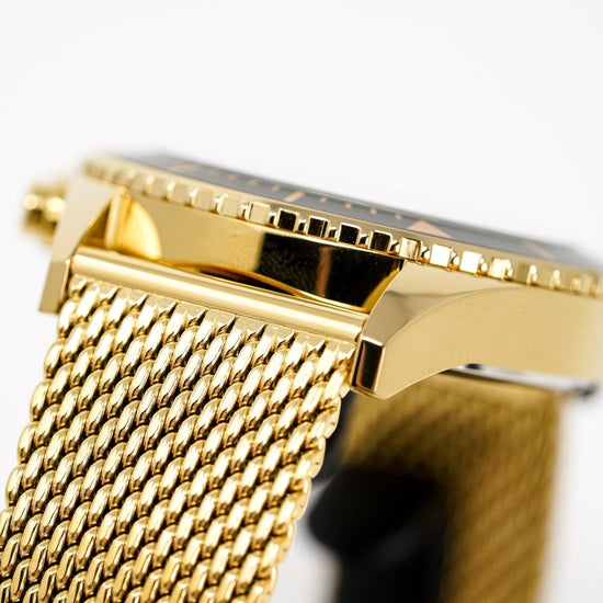 46mm yellow gold pvd plated stainless steel case. scratch resistant mineral crystal.