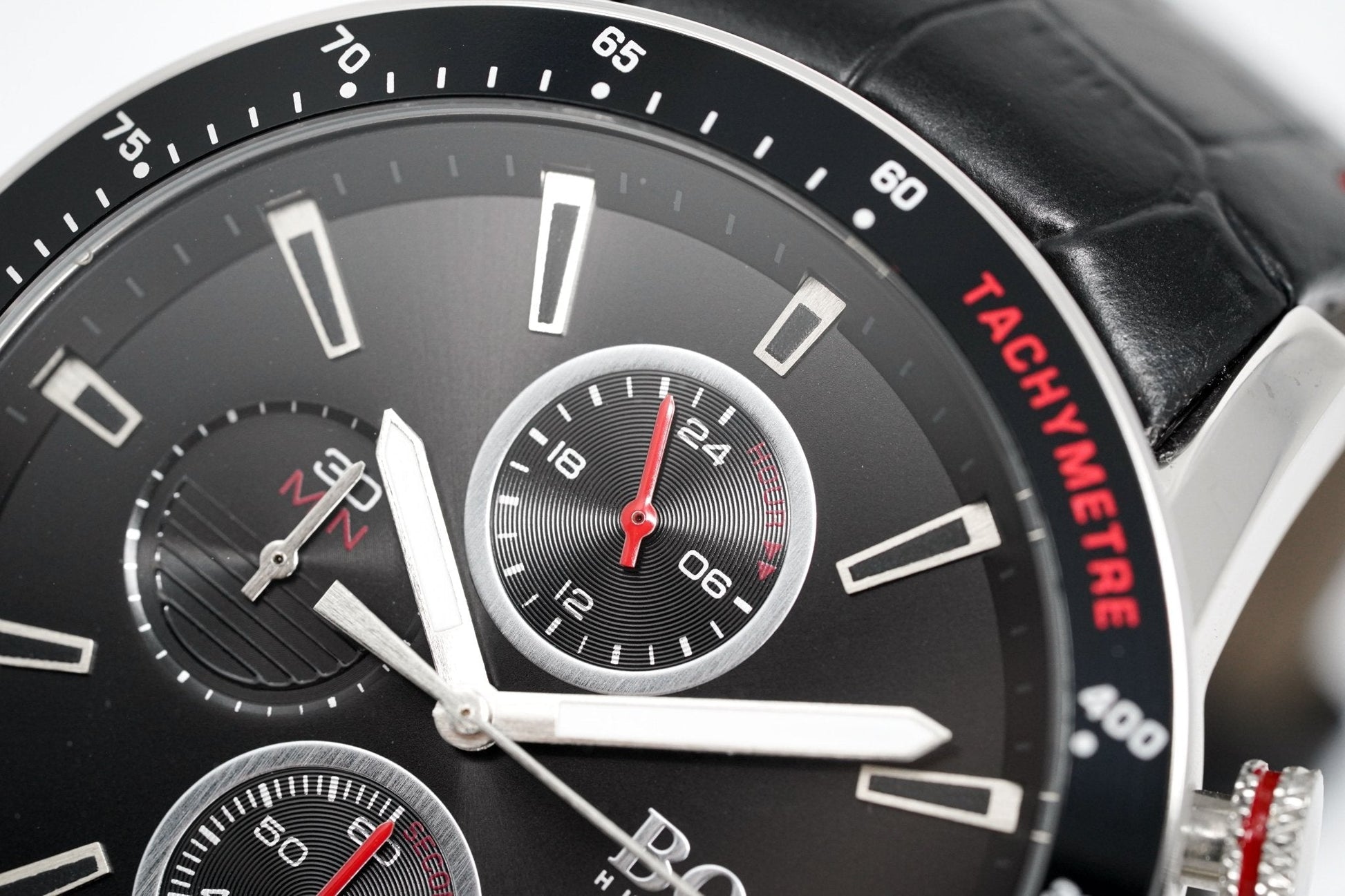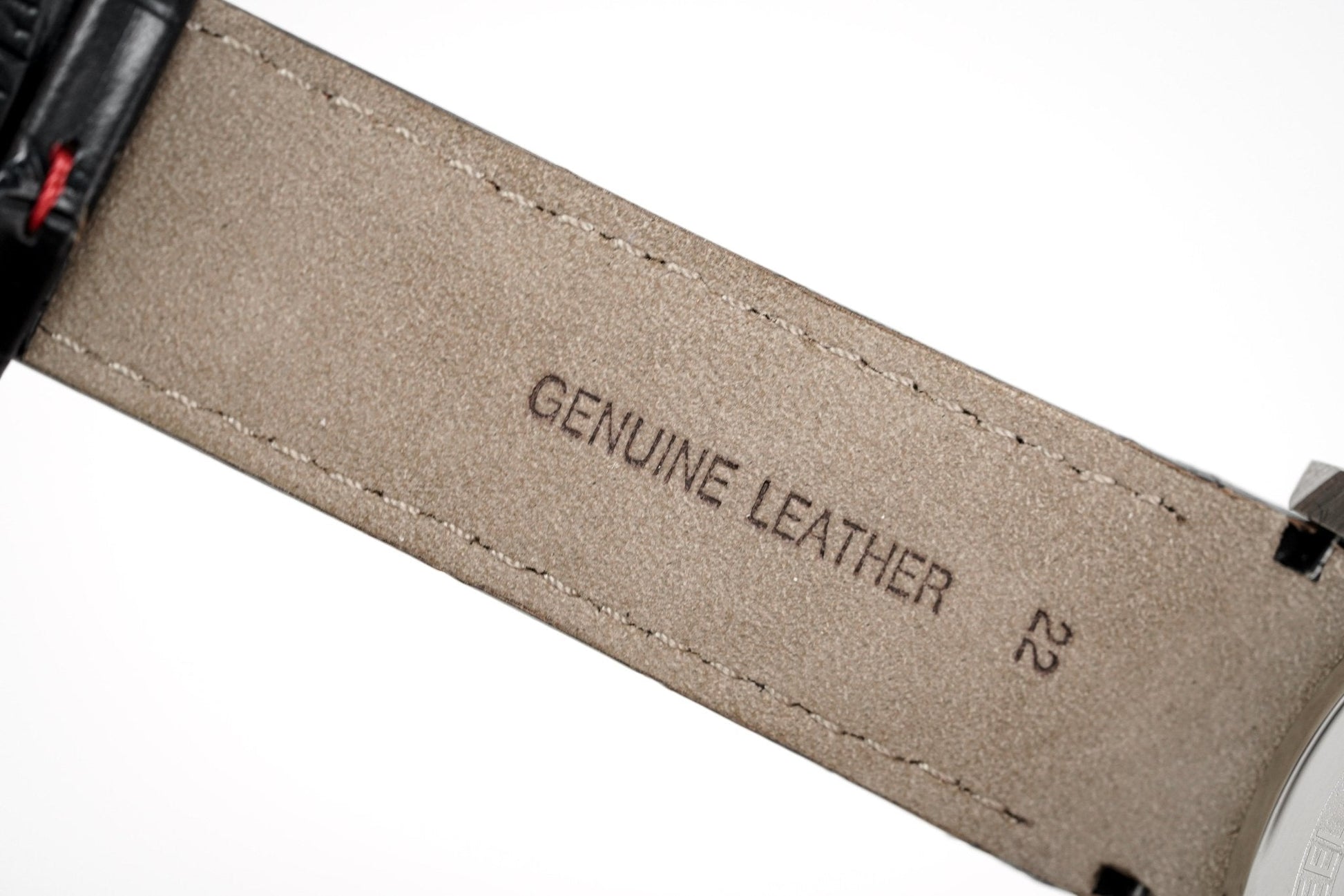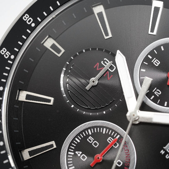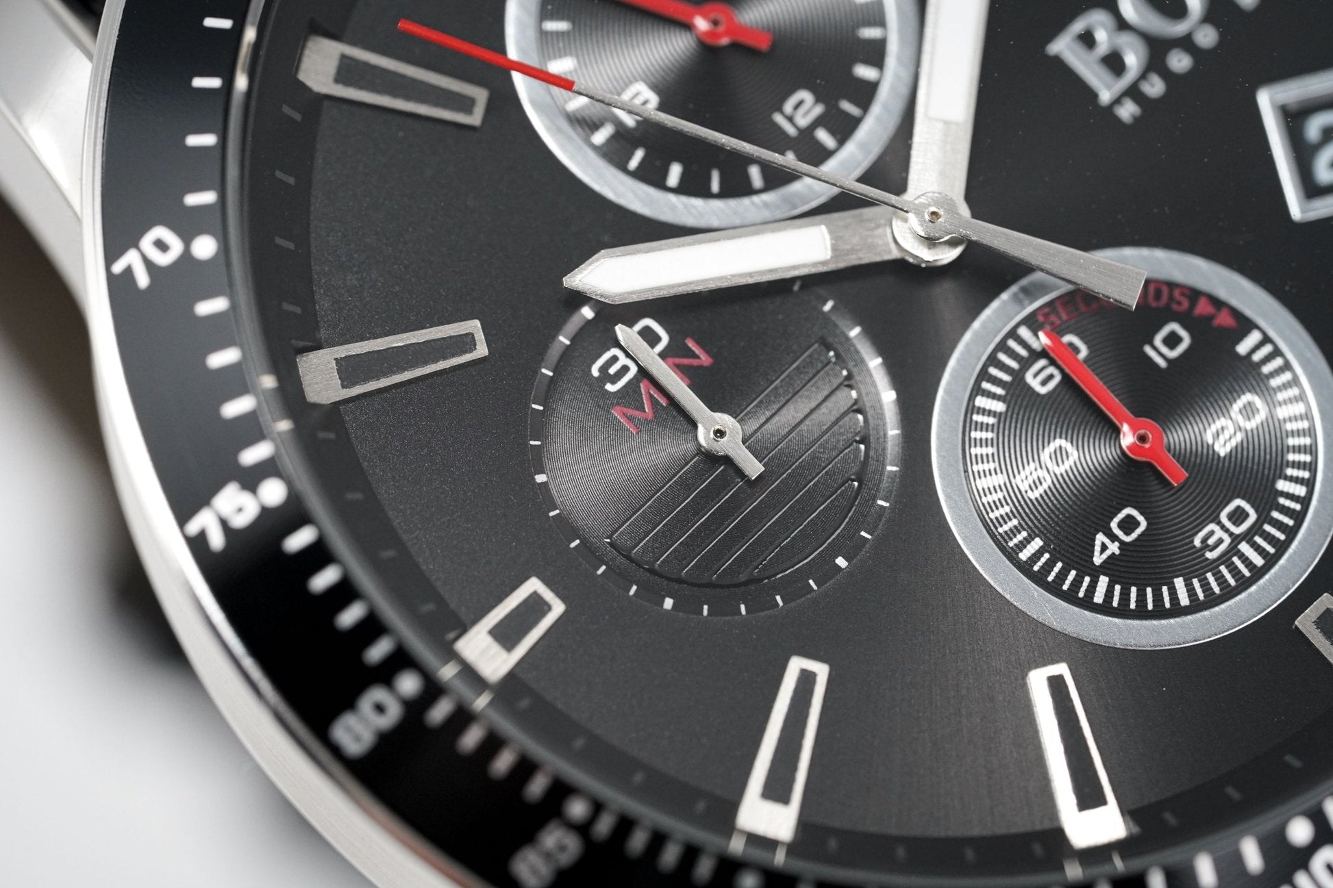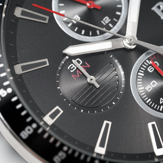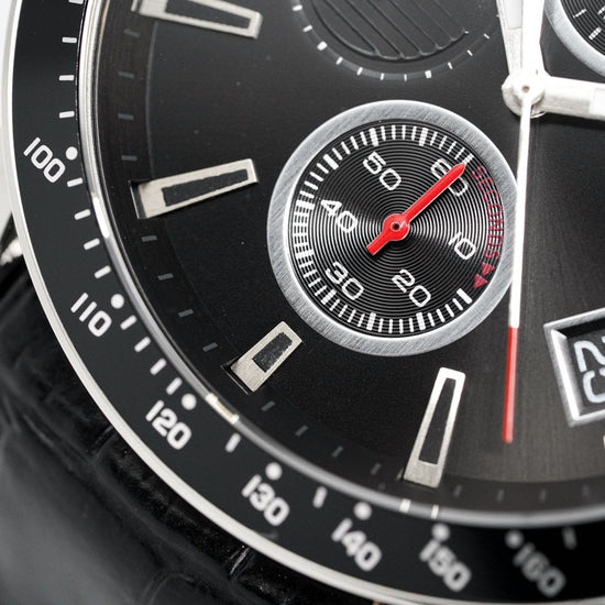 japanese made quartz chronograph movement. running seconds. 30 minute counter. 24 hour indicator. date.