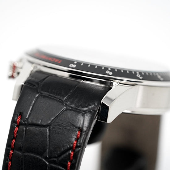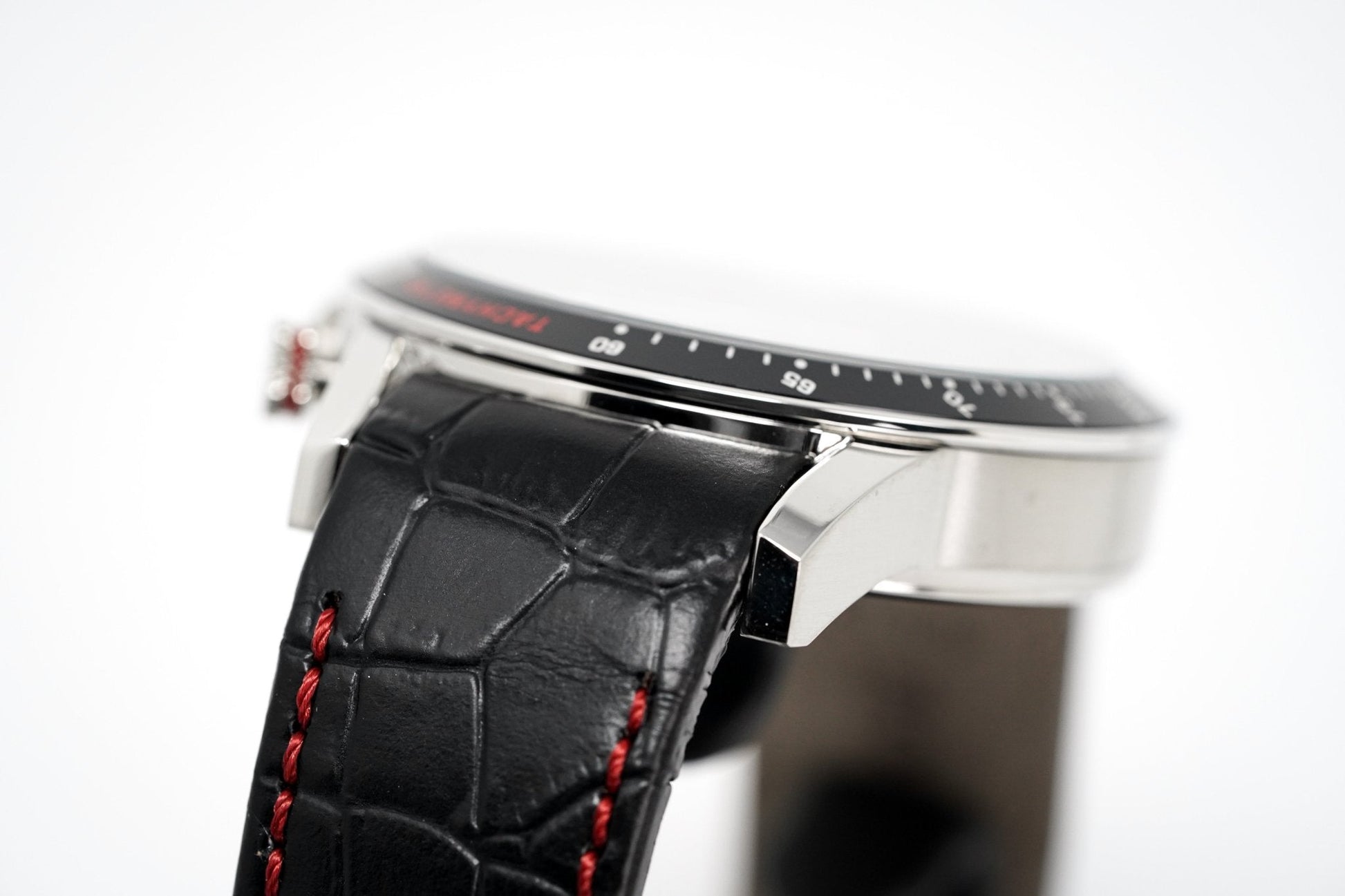 44mm stainless steel case. scratch resistant mineral crystal. tachymeter bezel.