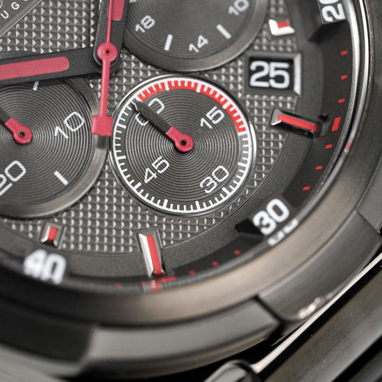 japanese made quartz chronograph movement. running seconds. 30 minute counter. 24 hour indicator. date.