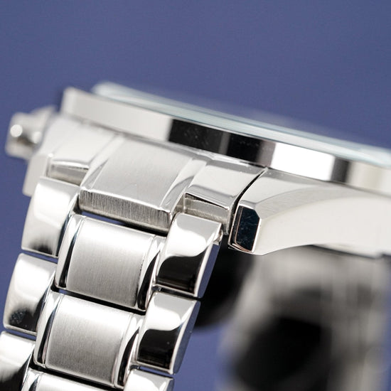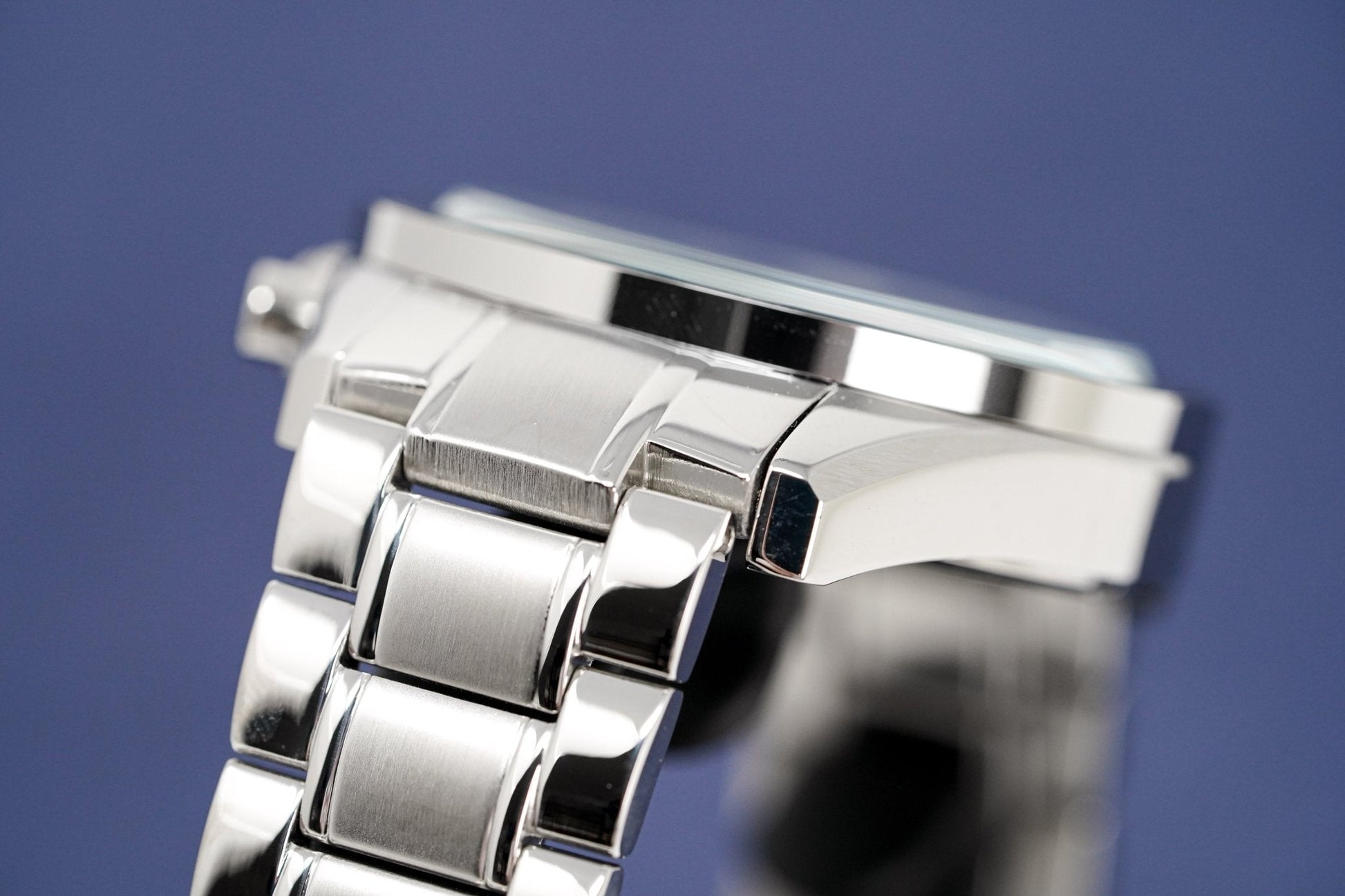 44mm stainless steel case. scratch resistant mineral crystal. tachymeter bezel.