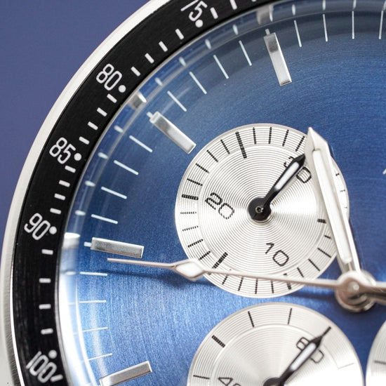 blue sunburst dial. luminous steel hands. luminous stainless steel stick indexes. date window at 4:30.
