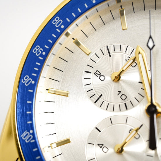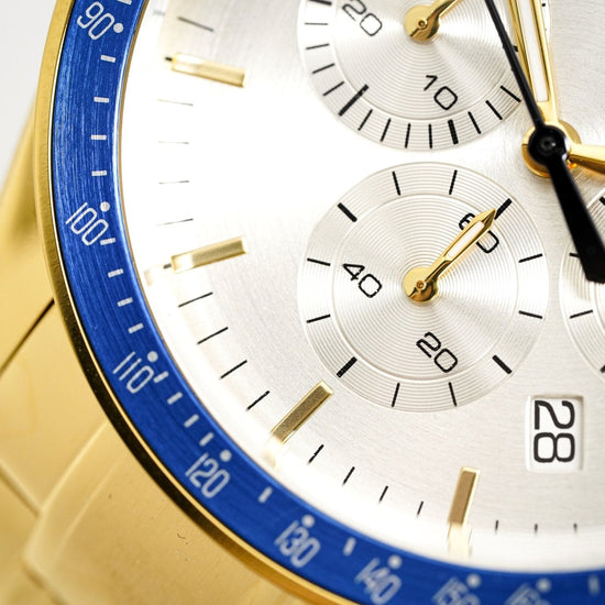 silver sunburst dial. luminous gold pvd plated steel hands. gold pvd plated stick indexes. date window at 4:30.
