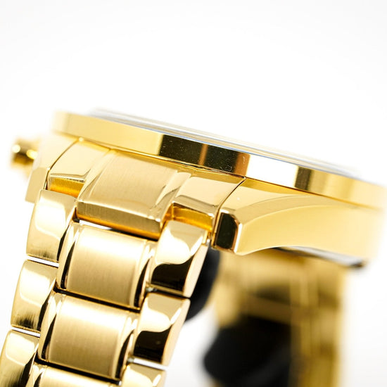 44mm yellow gold stainless steel case. scratch resistant mineral crystal. tachymeter bezel.