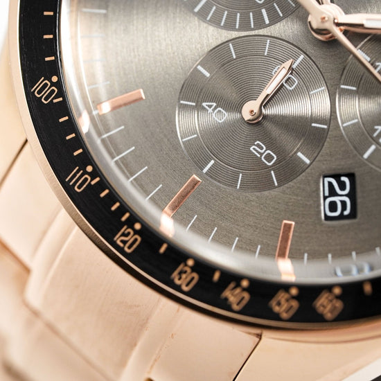 grey sunburst dial. luminous rose gold pvd plated steel hands. rose gold pvd plated stick indexes. date window at 4:30.