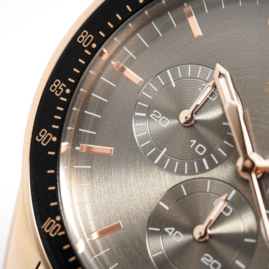 44mm rose gold stainless steel case. scratch resistant mineral crystal. tachymeter bezel.