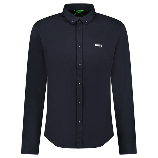 the boss motion shirt in dark navy is a must-have for the modern wardrobe, combining style and functionality. crafted from pure cotton jersey, this shirt offers exceptional comfort and breathability, making it perfect for all-day wear. designed with an anti-wrinkle finish, it maintains a sharp look with minimal effort. the regular-fit silhouette ensures a flattering yet relaxed feel, while the smart collar adds a refined touch. a contrast boss logo on the chest completes the design with a subtle signature detail.