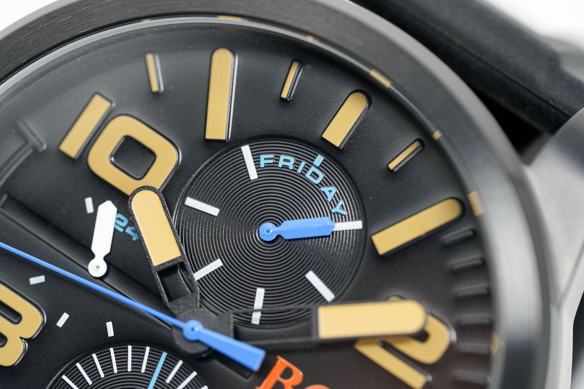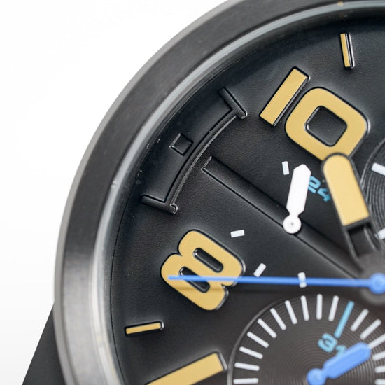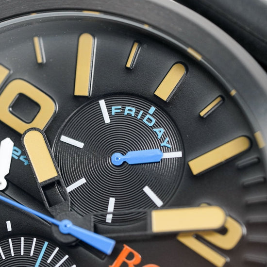 japanese made quartz movement. day and date subdials with 24 hour subdial.
