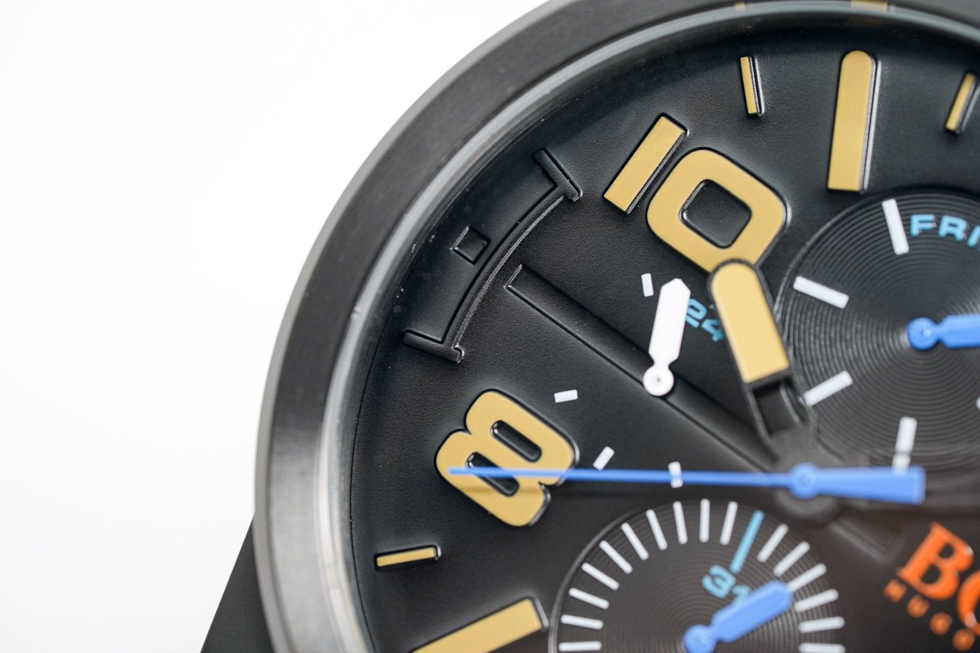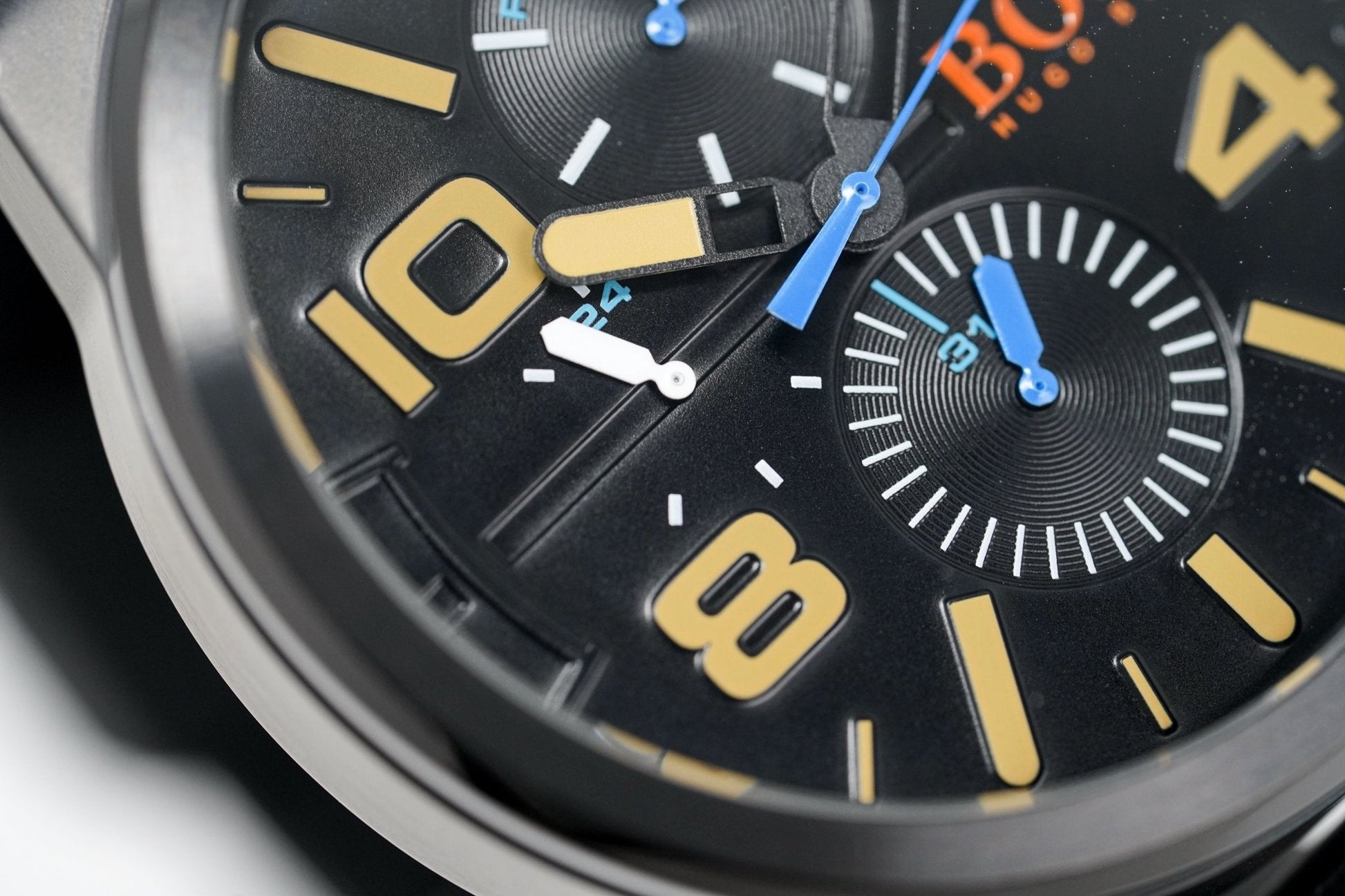 black dial. luminous steel hands. orange markers. date on subdial.