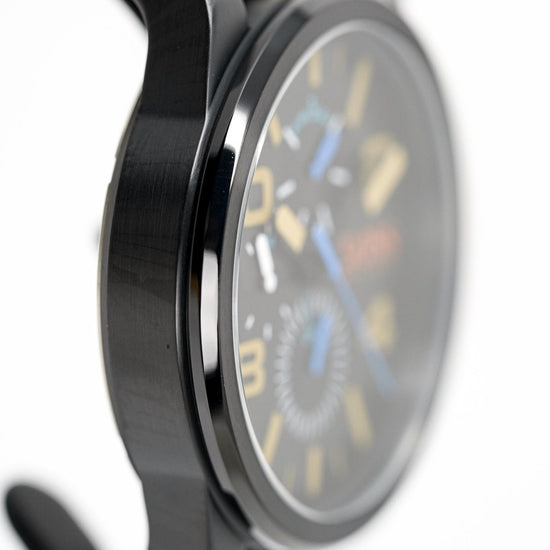 48mm stainless steel black case. scratch resistant mineral crystal.