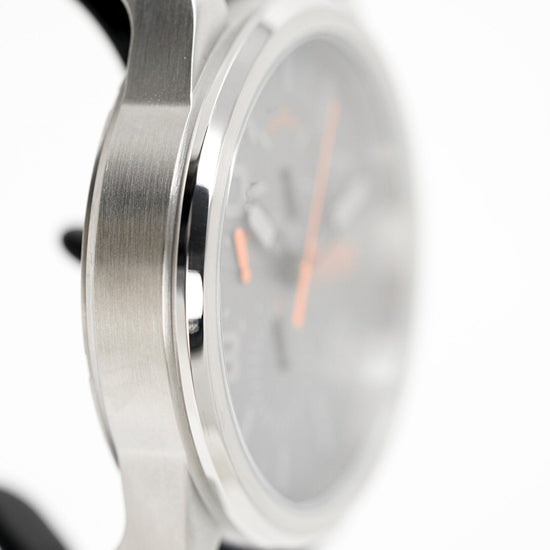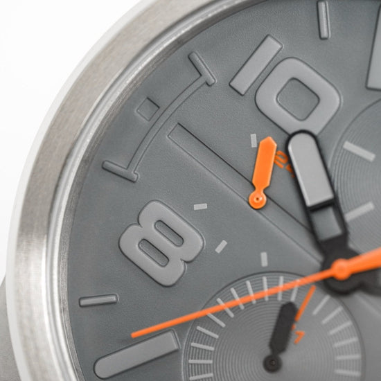 grey dial. luminous steel hands. grey markers. date on subdial.