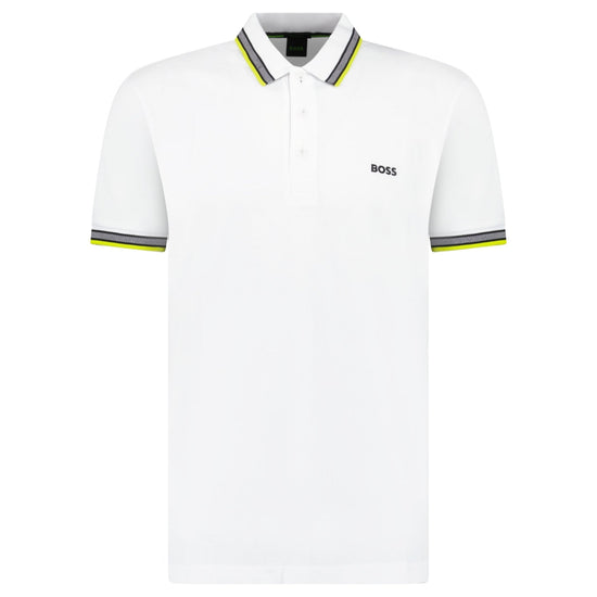 elevate your wardrobe with the hugo boss paddy polo shirt in white. crafted from 100% cotton, this polo blends breathable comfort with refined detailing. featuring a three-button placket, ribbed collar, and cuffs with contrasting stripe accents, it offers a modern twist on a classic silhouette. finished with the boss logo embroidered on the chest, it’s a versatile piece perfect for smart-casual styling.