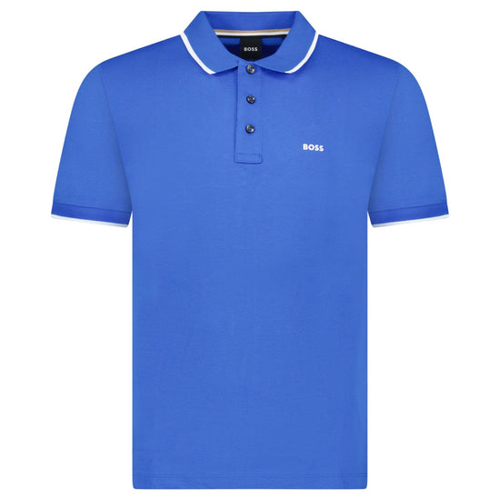 the boss parley 190 polo shirt in royal blue is a refined addition to your wardrobe, offering a perfect balance of style and sophistication. crafted from mercerised cotton, this polo shirt features a three-button branded pearlescent placket and a ribbed polo collar with contrasting blue tipping. the ribbed cuffs on the short sleeves also feature the same subtle blue tipping, enhancing the overall sleek design.