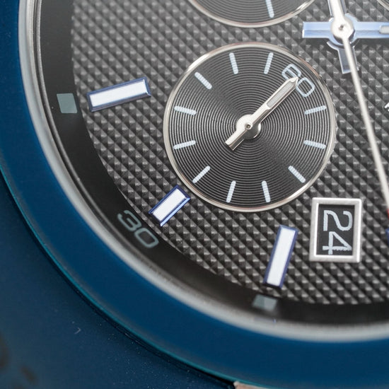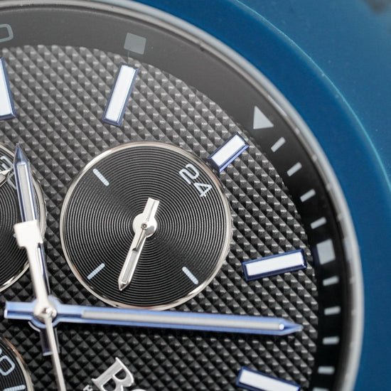 japanese made quartz chronograph movement. 24 hour counter. running seconds. 30 minute counter. date.