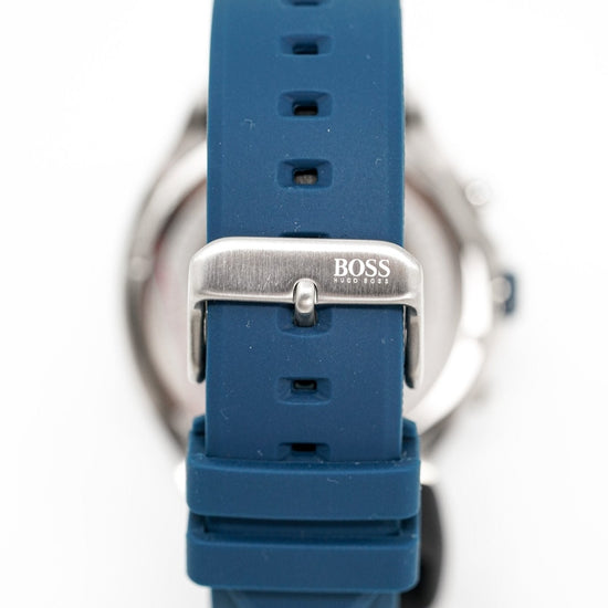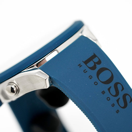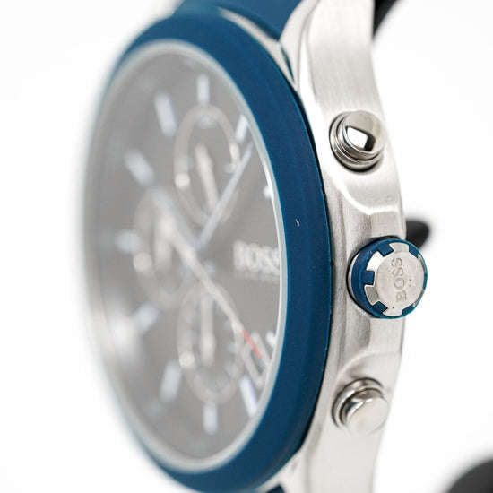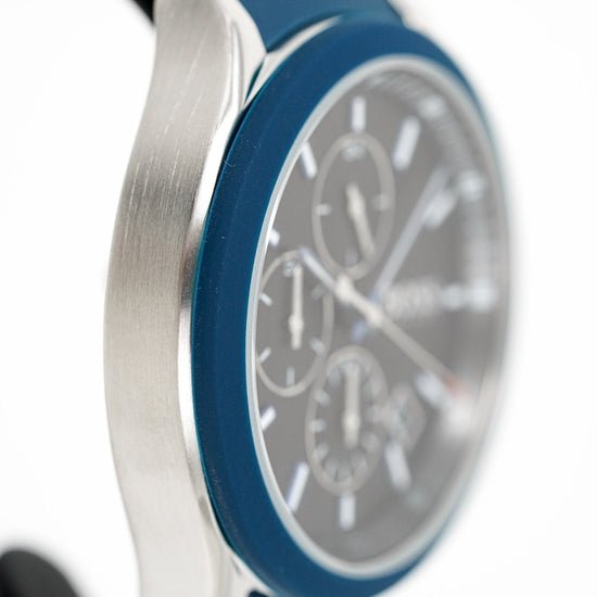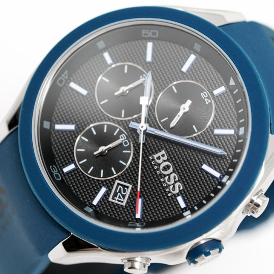 black motif dial. luminous blue steel hands. stainless steel blue stick markers. date window at 4:30.