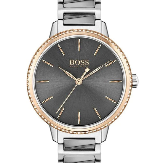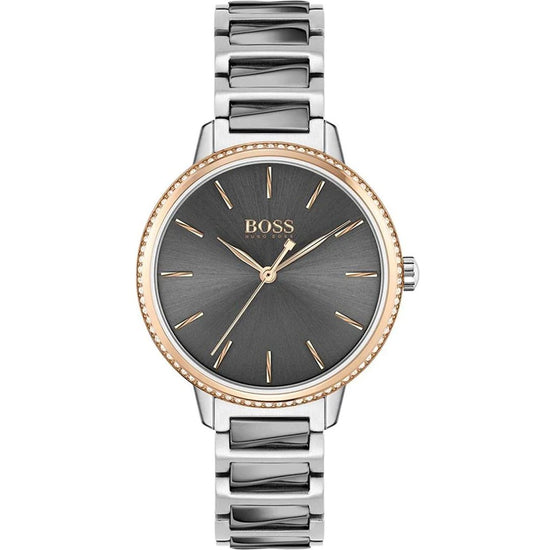 the hugo boss 1502569 signature watch is a classic and elegant timepiece designed for women. featuring a two-tone stainless steel bracelet with a combination of silver and rose gold tones, this watch offers both sophistication and modern style. the grey dial is adorned with simple hour, minute, and second hands, offering a clean and refined look. its 34mm case size ensures a comfortable fit on the wrist. this watch is perfect for both everyday wear and special occasions, combining durability with stylish aesthetics.