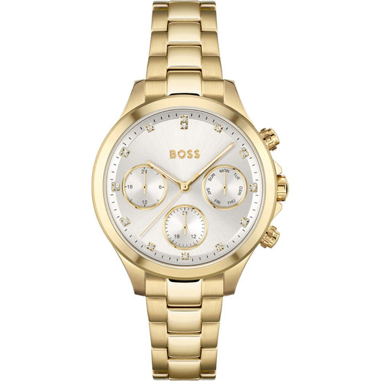 the hugo boss 1502628 hera gold-tone stainless steel watch is a luxurious and elegant timepiece that exudes sophistication and style. this stunning watch features a gold-tone stainless steel case and bracelet, offering a rich and polished look. the silver-tone dial is beautifully complemented by gold-tone hands and markers, with sparkling crystal accents at each hour position for a touch of glamour. the watch also includes three sub-dials that display the day, date, and 24-hour time, making it as functional as it is stylish. ideal for both formal occasions and everyday wear, the hugo boss hera watch is the perfect accessory for the modern woman.