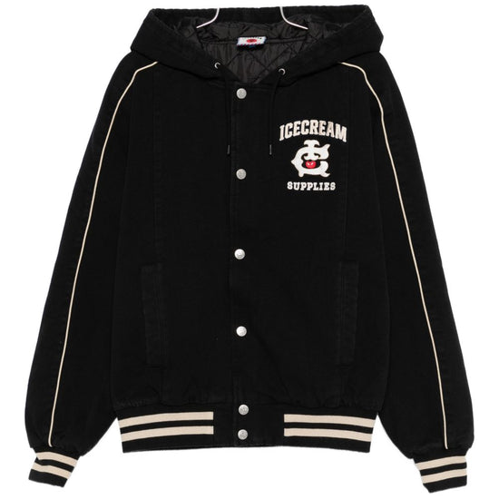Washed black logo embroidered button fastening front pockets striped hem striped cuffs cotton hooded bomber jacket
