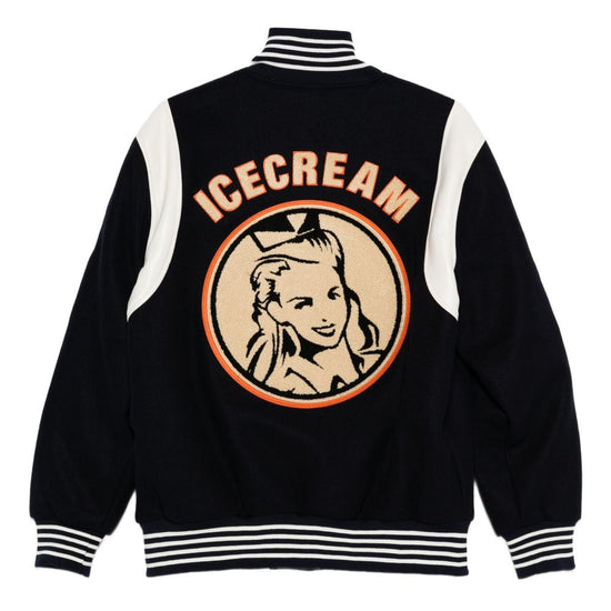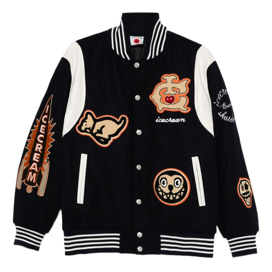 Navy blue appliqué patches ribbed trims button fastening contrasting sleeves varsity bomber jacket