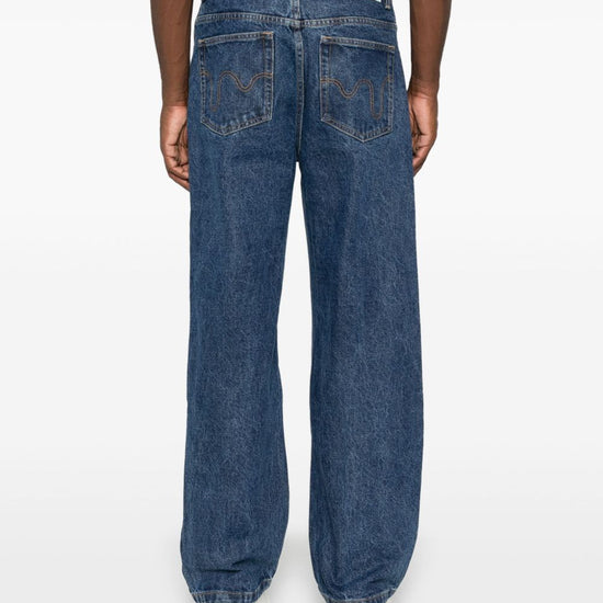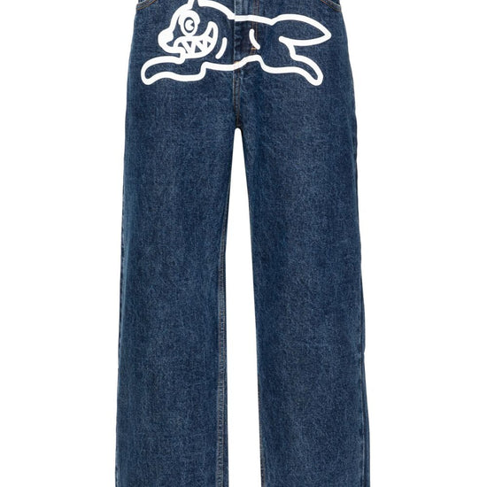 Indigo blue cotton denim running dog graphic print to the front logo patch to the rear belt loops front button and zip fastening straight leg classic five pockets straight hem running dog denim jeans