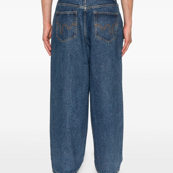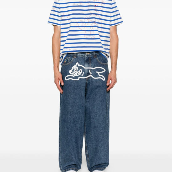 Medium-wash blue embroidered dog motif five-pocket styling button fly straight leg cotton construction running dog denim jeans