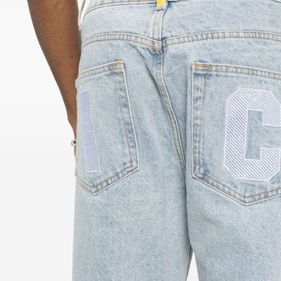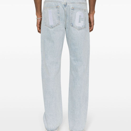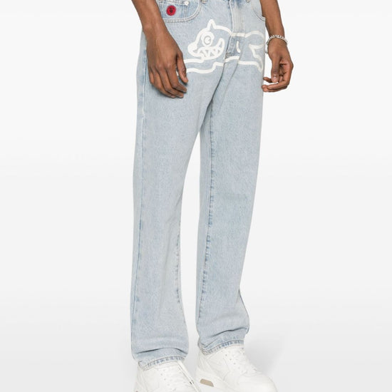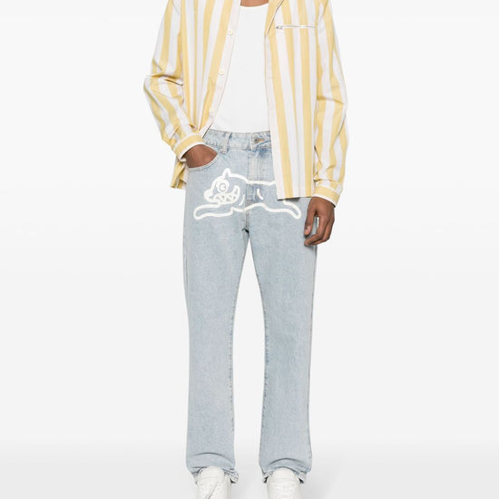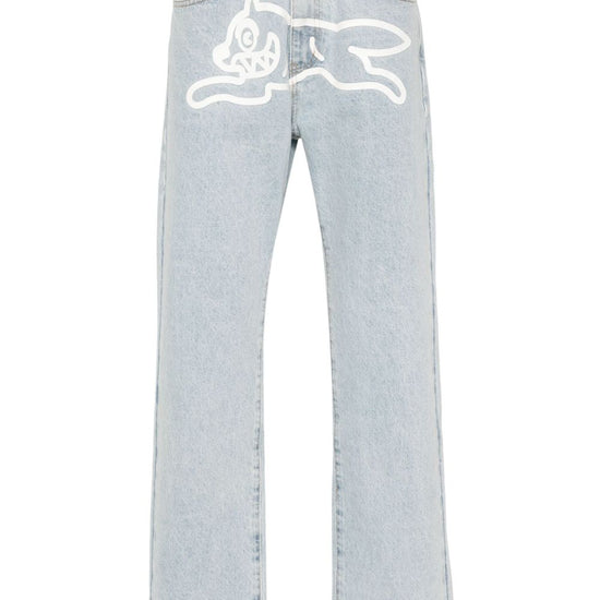 Light blue cotton washed denim straight leg belt loops classic five pockets ic signet embroidery at the front running dop print at the front embroidered logo to the rear front button and zip fastening running dog denim jeans