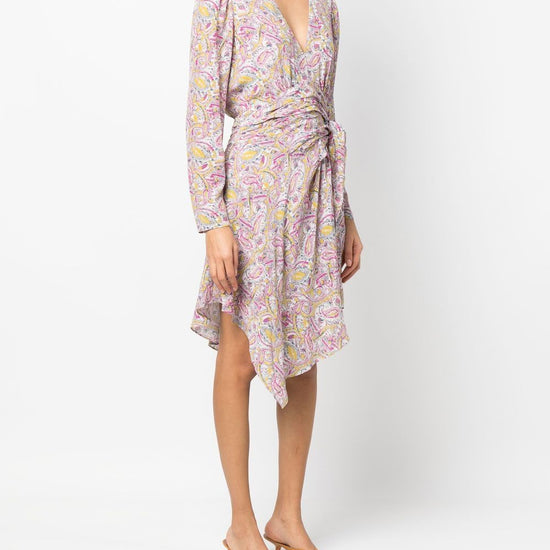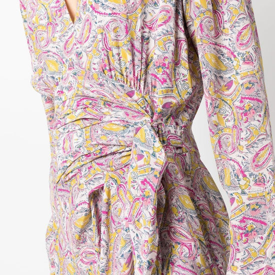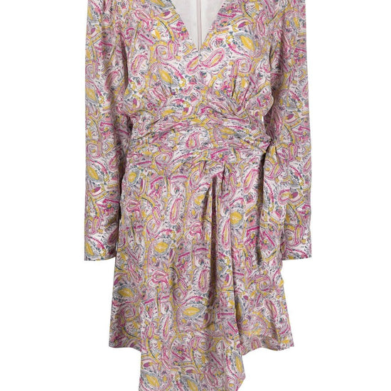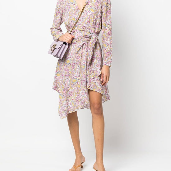 Graphic-print wrap minidress from iro featuring pink, all-over graphic print, wrap design, v-neck, tied waist, long sleeves and draped detailing. taro short wrap dress size and fit - this piece fits true to size. we recommend you get your regular size. model is 1,75m / 5ft 8in wearing size 36 (fr)