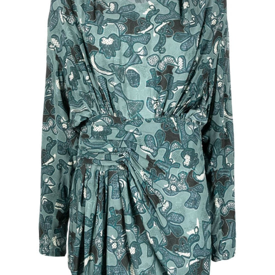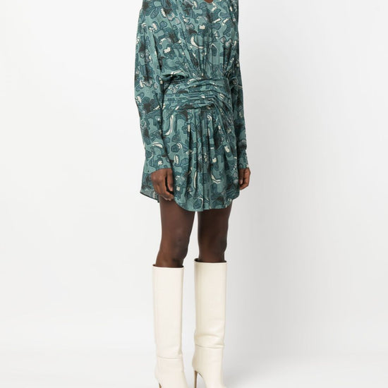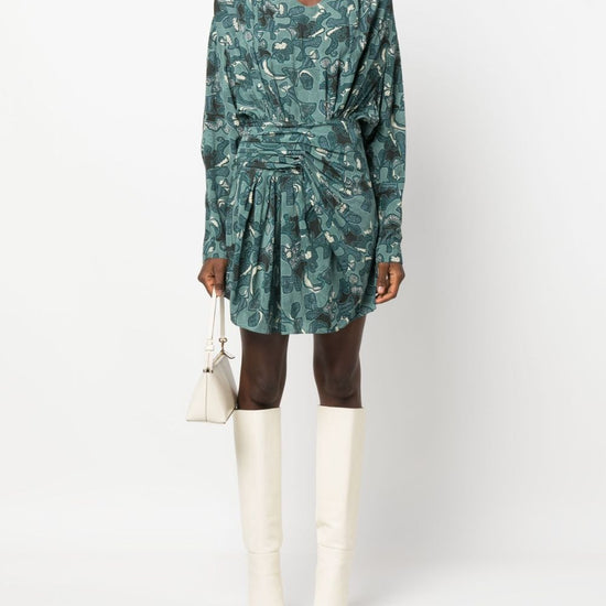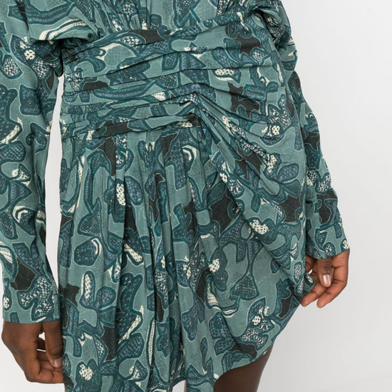 Fontana printed short dress from iro featuring green, abstract pattern print, draped detailing, scoop neck, long sleeves, concealed side fastening and rear curved hem. fontana printed short dress size and fit - this piece fits true to size. we recommend you get your regular size. model is 1,75m / 5ft 8in wearing size 36 (fr)