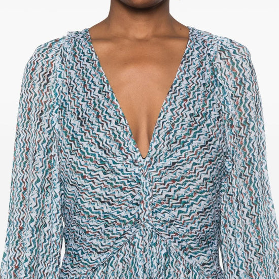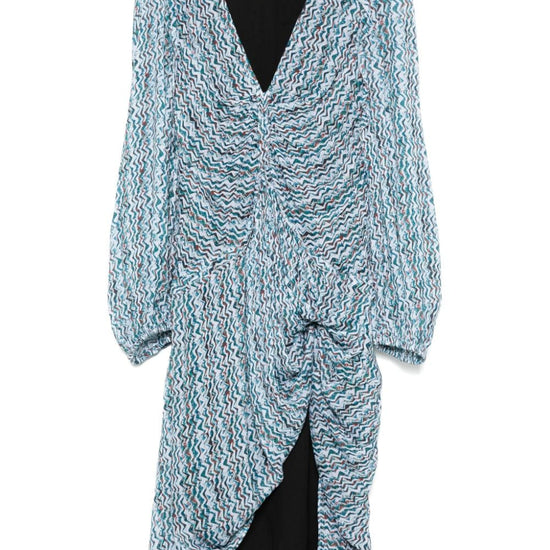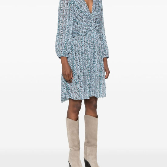 Turquoise blue-green/multicolour cady texture all-over graphic print v-neck semi-sheer sleeves elasticated cuffs gathered detailing pleated skirt full lining curved hem above-knee length ruline short dress size and fit - this piece fits true to size. we recommend you get your regular size. model is 1,75m / 5ft 8in wearing size 36 (fr)