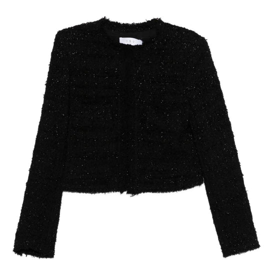 Black tweed texture frayed edges cropped length long sleeves round neck safira cotton blend jacket