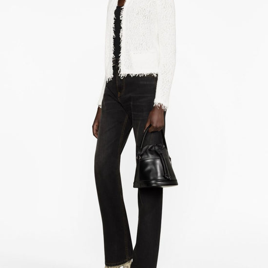 White cotton blend textured finish fringe detailing round neck open front long sleeves two side welt pockets shavani cotton jacket