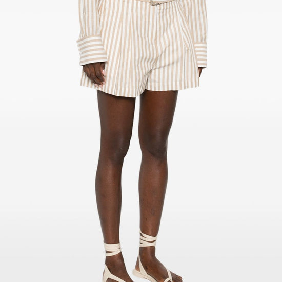 White and light beige striped pattern belt buckle pleated anemone striped cotton shorts