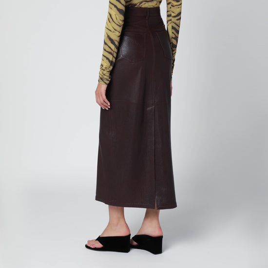 Ivy oak midi skirt in burgundy lambskin, featuring zip and button closure, high waist with belt loops, two front pockets, two back pockets, and back slit. size and fit - model wears size 34 dk model measurements: height: 178 cm chest: 83 cm waist: 63 cm hips: 91 cm