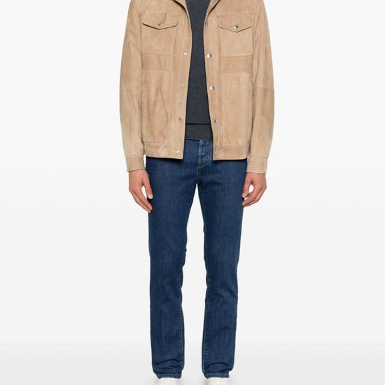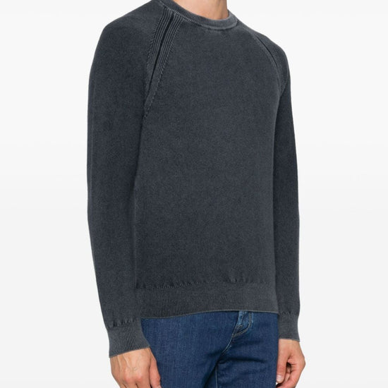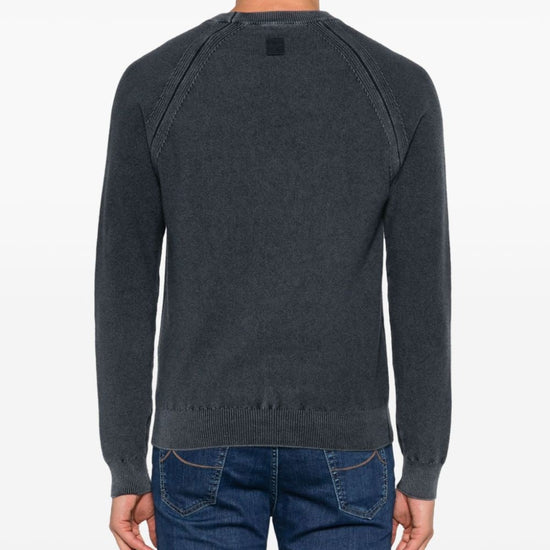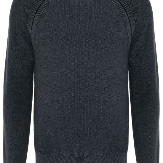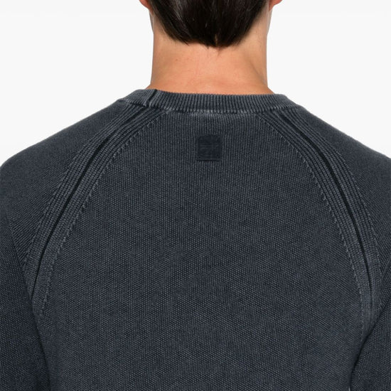 Navy blue cashmere knitted construction logo patch to the rear crew neck long raglan sleeves ribbed cuffs and hem cashmere crewneck sweater size and fit - this piece fits true to size. we recommend you get your regular size. model is 1,84m / 6ft 1in wearing size m