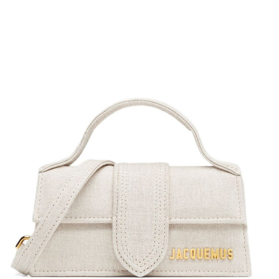 Light beige gold-tone logo visible stitching removable adjustable shoulder strap back card slot magnetic closure le bambino handbag size and fit - height: 9.0 centimetres. width: 17.5 centimetres.