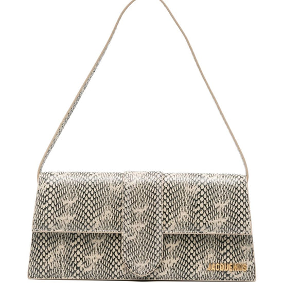 Beige snakeskin print single top handle fold-over flap magnetic closure internal slip pocket le bambino long shoulder bag