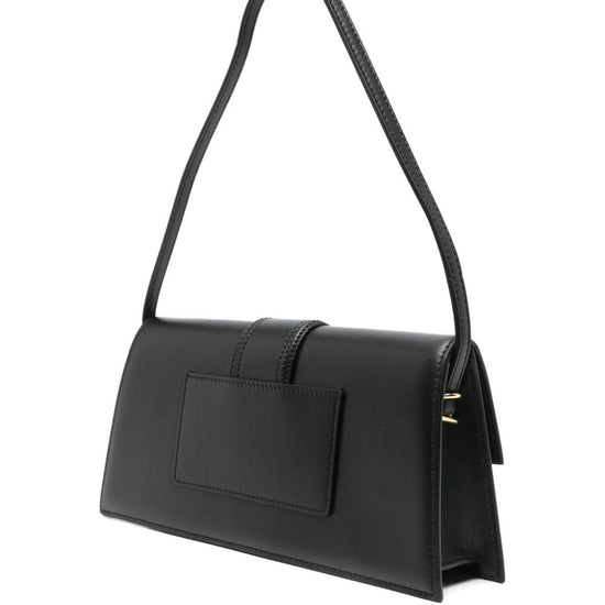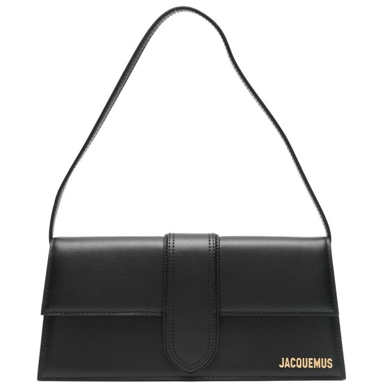 Black leather bag. it features a thin, non-adjustable shoulder strap, gold-tone metal finishes and logo, an external pocket on the back, magnetic flap closure, one main compartment with an open pocket. dustbag included. any imperfections in the leather should not be considered manufacturing defects but a characteristic of the material.dimensions: 28 x 13.5 x 5 cmsize nationality: uni100% cow leather; lining: 100% cotton; details: brass gold100% cow leather; lining: 100% cotton; details: brass gold le bambino long shoulder bag