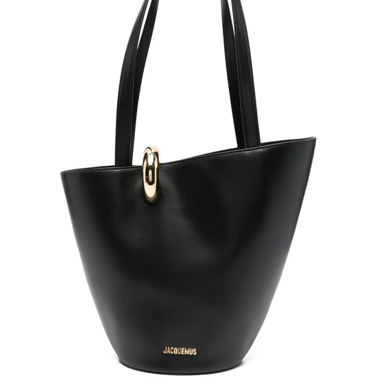 Black two flat top handles gold-tone logo lettering internal zip-fastening pocket full lining le bambola moyen leather bucket bag size and fit - . depth 19 cm. handle 32 cm. height 31 cm. width 42 cm.