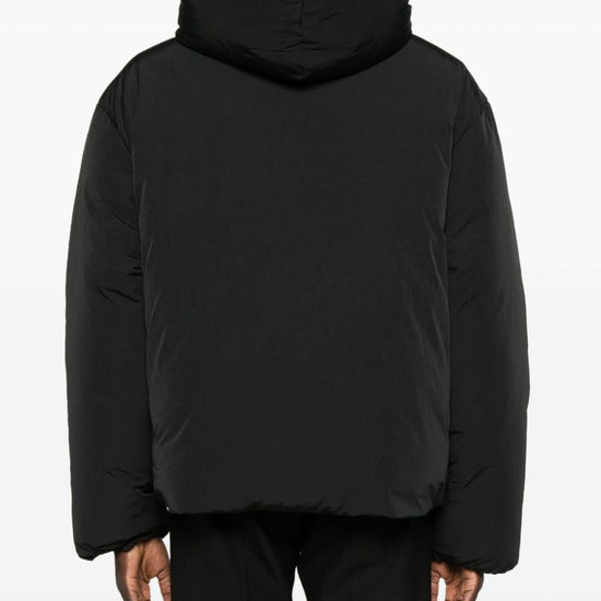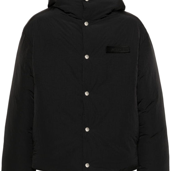 Black shell padded design classic hood funnel neck long sleeves elasticated cuffs detachable appliqué logo to the chest two side inset pockets multiple internal slip pockets full lining drawstring hem concealed front zip fastening logo studs front press-stud fastening la doudoune down jacket size and fit - this piece fits true to size. we recommend you get your regular size. model is 1,84m / 6ft 1in wearing size 48 (it)