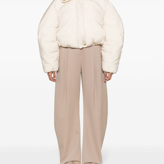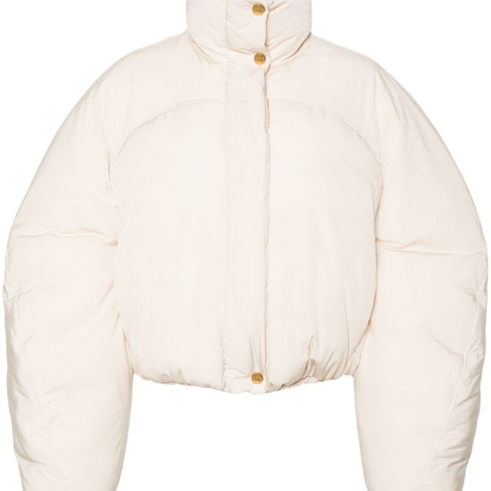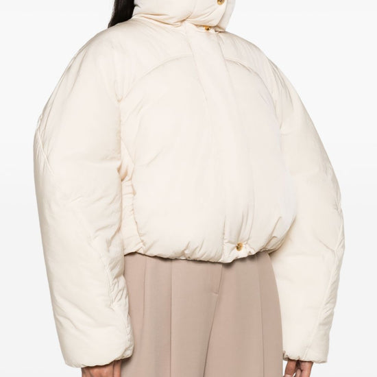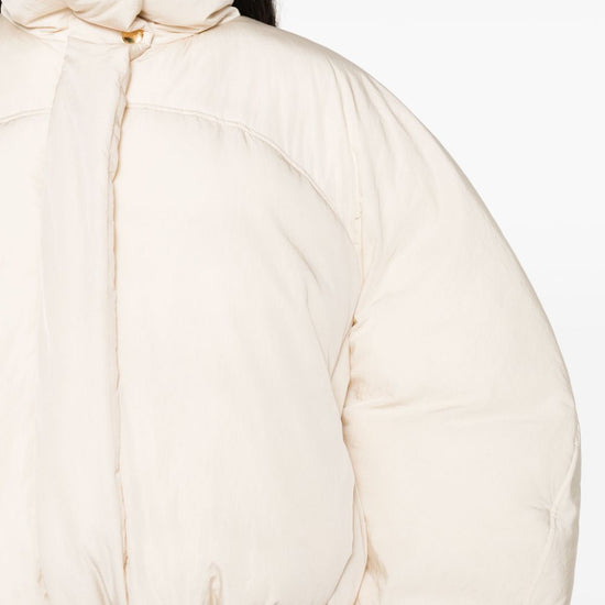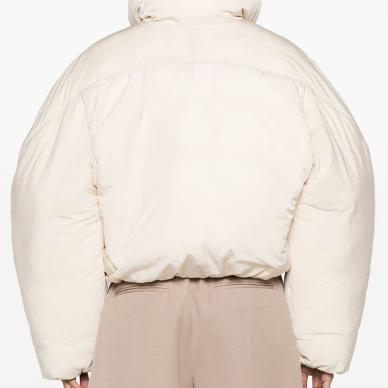 Off-white padded design funnel neck front press-stud and zip fastening long sleeves elasticated cuffs elasticated hem two side slit pockets full lining gold-tone hardware la doudoune courte caraco down jacket size and fit - this piece fits true to size. we recommend you get your regular size. model is 1,75m / 5ft 8in wearing size 36 (fr)