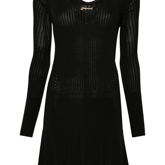 Black ribbed knit gold-tone logo plaque wide neck long sleeves elasticated cuffs flared skirt scallop hem thigh-length la mini robe pralu dress size and fit - this piece fits true to size. we recommend you get your regular size. model is 1,75m / 5ft 8in wearing size 36 (fr)