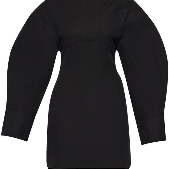 Black cotton poplin texture yoke design layered details cut-out detailing belt loops belted waist silver-tone hardware boat neck rear zip fastening long puff sleeves side slits front patch pocket curved hem la robe chemise casaco dress size and fit - this piece fits true to size. we recommend you get your regular size. model is 1,75m / 5ft 8in wearing size 36 (fr)