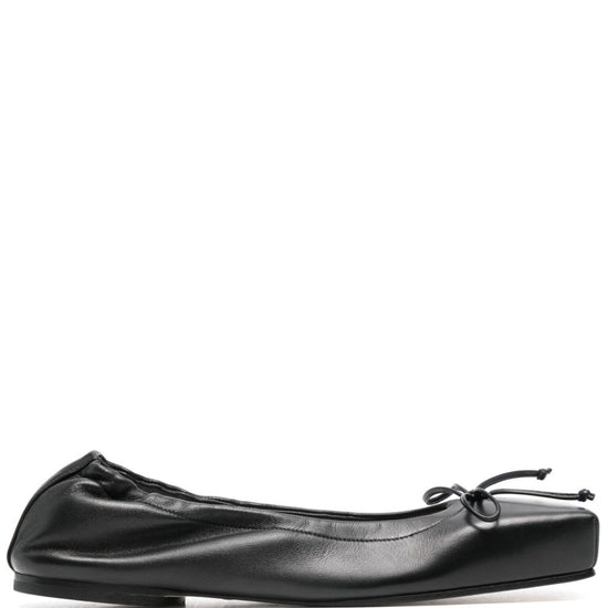 Black calf leather smooth grain slip-on style elasticated trim front bow detailing square toe branded leather insole flat leather sole this piece comes complete with a protective dust bag. les ballerines ballet size and fit - heel 1 cm