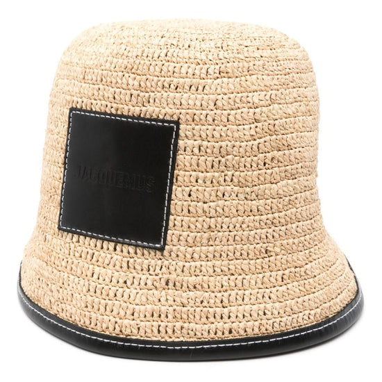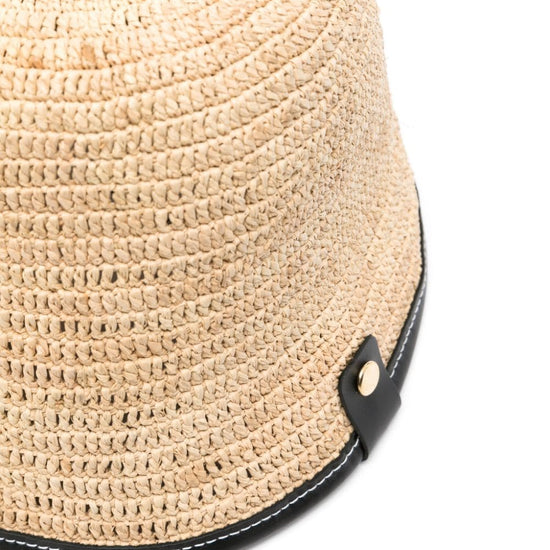 Beige/black raffia woven raffia design contrasting trim flat crown dropped wide brim leather logo patch to the front pull-on style le bob soli bucket hat size and fit - circumference: 58.0 centimetres.