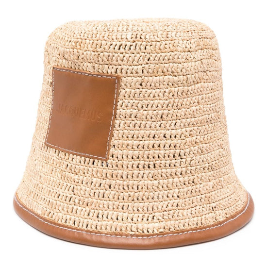 Beige/camel brown raffia interwoven design contrasting trim bucket body logo patch to the front side press-stud fastening detail unlined pull-on style le bob soli bucket hat