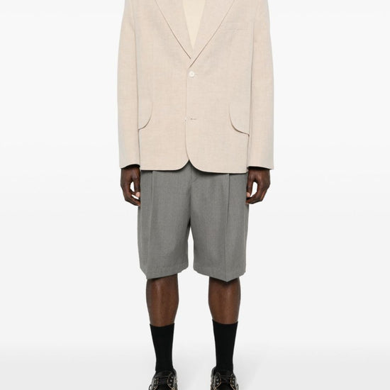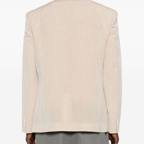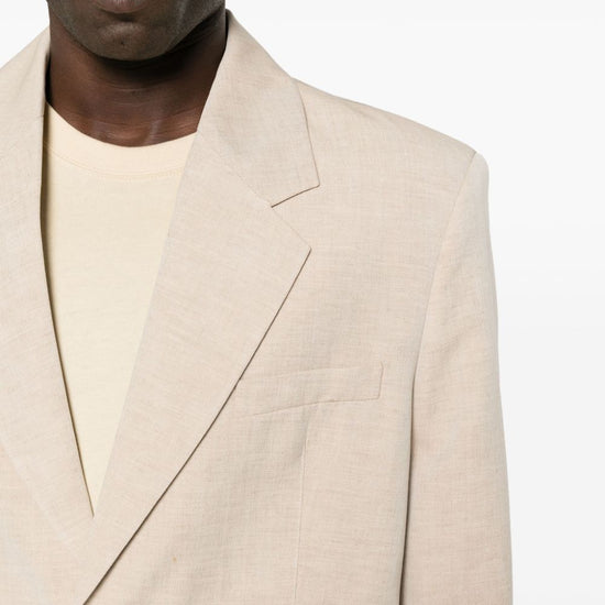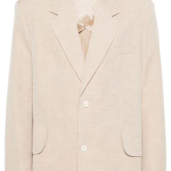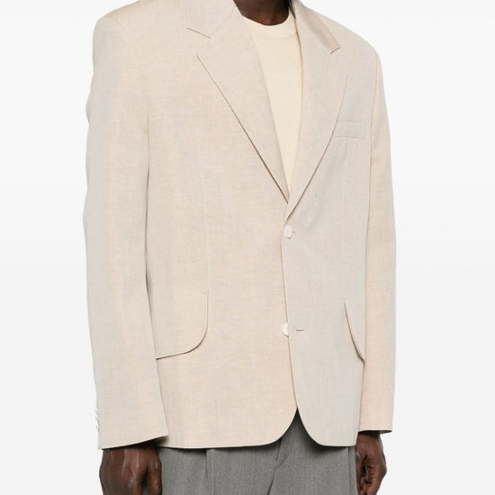 Medium beige linen-virgin wool blend notched lapels shoulder pads long sleeves faux buttoned-cuff sleeves chest welt pocket two front flap pockets central rear vent internal slip pockets partial lining front button fastening la veste titolo blazer jacket size and fit - this piece fits true to size. we recommend you get your regular size. model is 1,84m / 6ft 1in wearing size 48 (it)