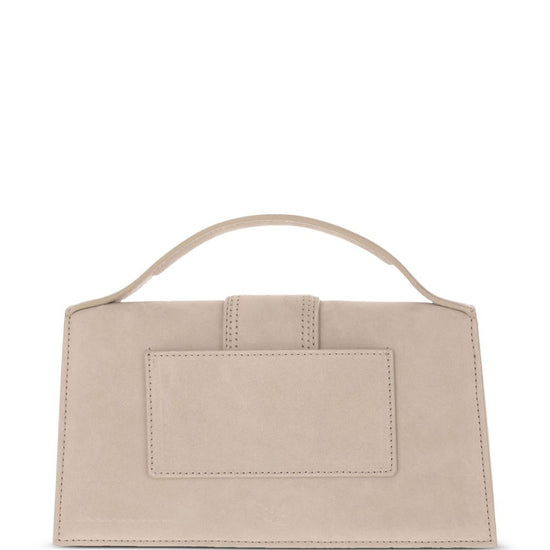 Beige suede top handle magnetic flap tab closure logo metal-plaque detachable and adjustable shoulder strap rear pocket le grand bambino leather handbag size and fit - width 23.5 .