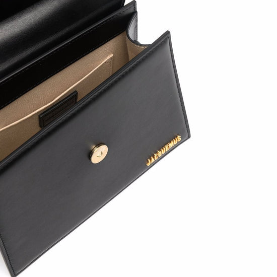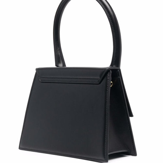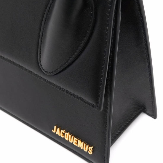Black leather le grand chiquito tote bag from jacquemus featuring single rounded top handle, gold-tone logo lettering, tonal stitching, adjustable detachable shoulder strap, foldover top with magnetic fastening, internal logo patch and internal slip pocket. le grand chiquito leather handbag size and fit - width 9,37 in / 23,8 cm height 6,69 in / 17 cm depth 3,74 in / 9,5 cm handle 5,51 in / 14 cm strap 19,29 in / 49 cm
