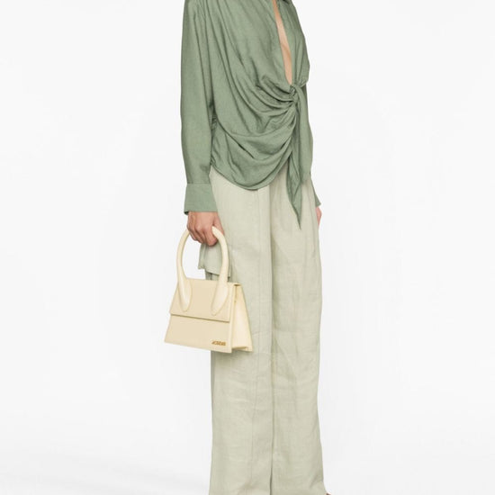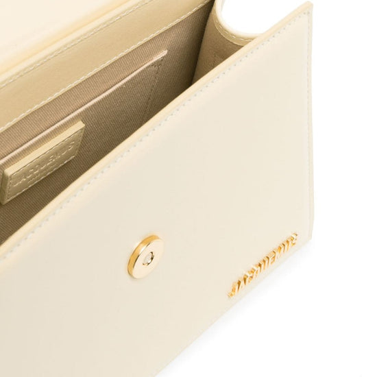 Le grand chiquito tote bag from jacquemus featuring ivory white, calf leather, gold-tone logo plaque, single rolled top handle, foldover top with magnetic fastening, adjustable detachable shoulder strap and main compartment. le grand chiquito leather handbag size and fit - width 9,06 in / 23 cm height 6,3 in / 16 cm depth 3,54 in / 9 cm handle 5,91 in / 15 cm strap 20,08 in / 51 cm