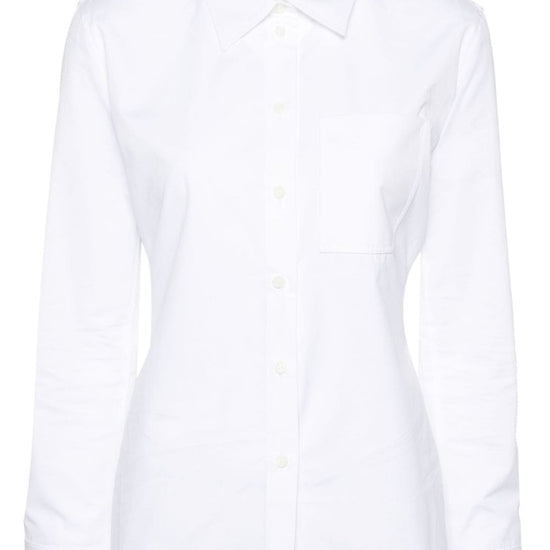 White cotton poplin texture classic collar long sleeves with buttoned cuffs chest patch pocket triangular open back with adjustable belt straight hem front button fastening la chemise de costume shirt size and fit - this piece fits true to size. we recommend you get your regular size. model is 1,75m / 5ft 8in wearing size 36 (fr)